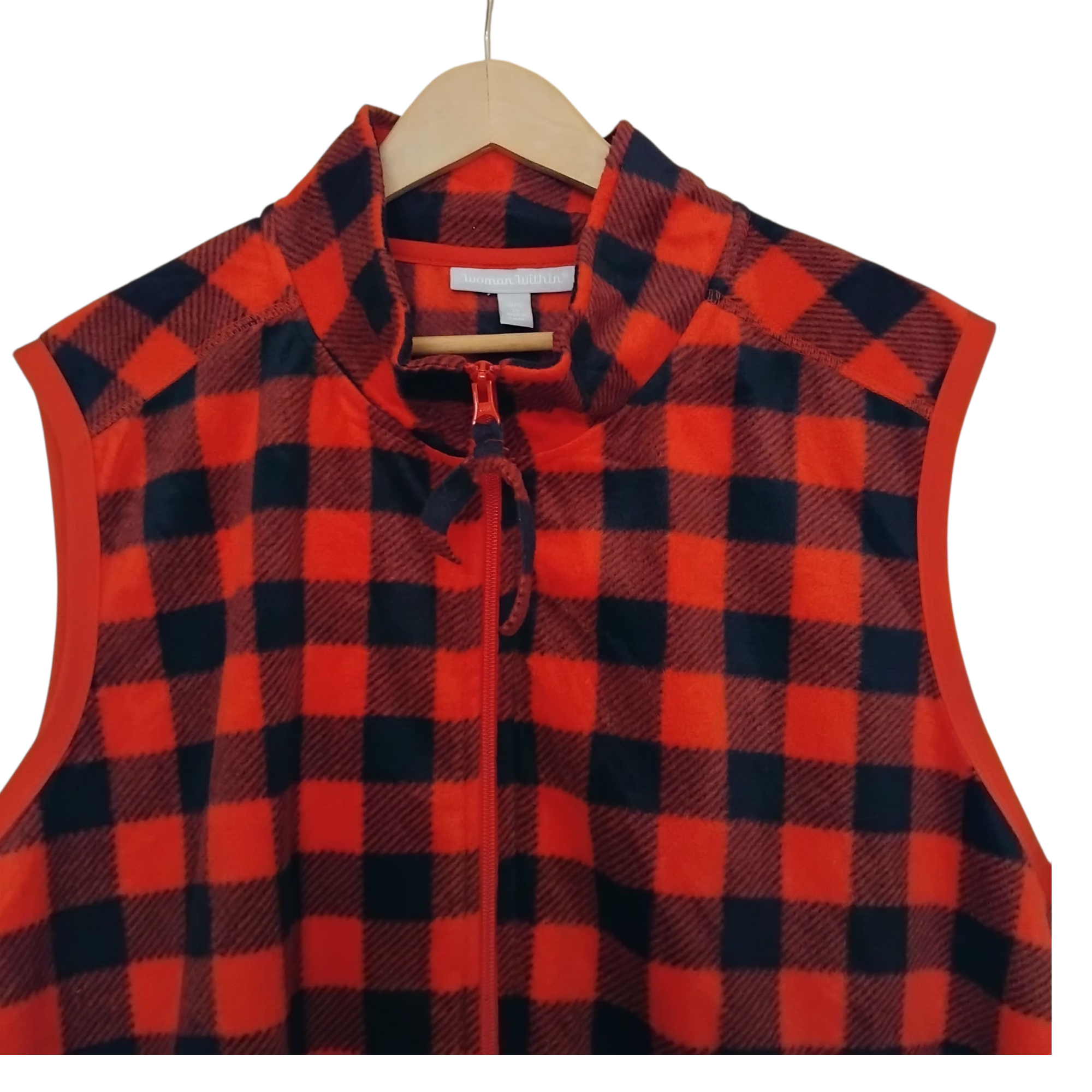 Bezrękawnik damski,polarowy w kratkę czerwono-czarną,zapinany na zamek,dwie boczne kieszenie.Nowy bez metki.