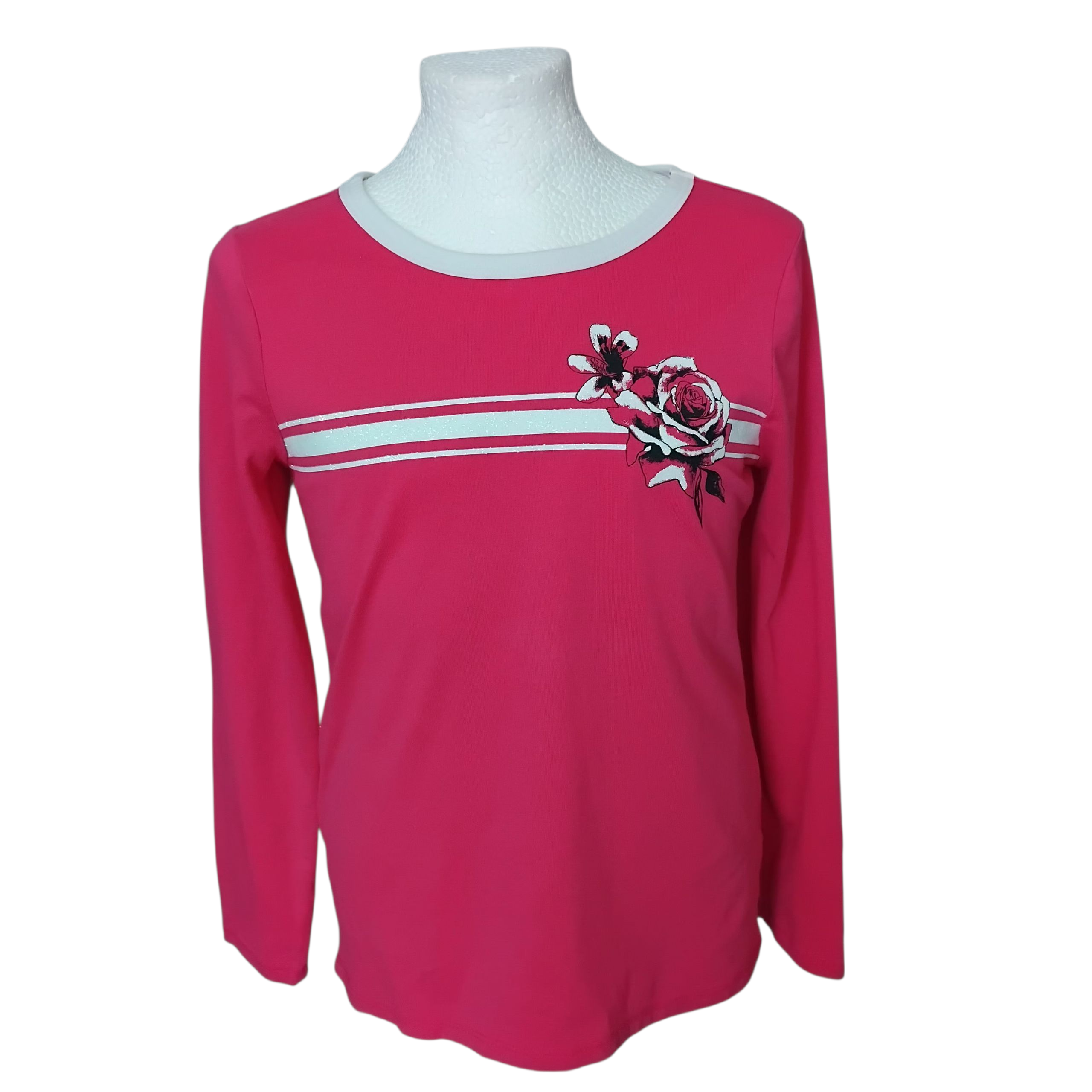 Bluzka dziewczęca różowa z aplikacją (róża i paski) z przodu,białe obszycie szyi,stan bardzo dobry