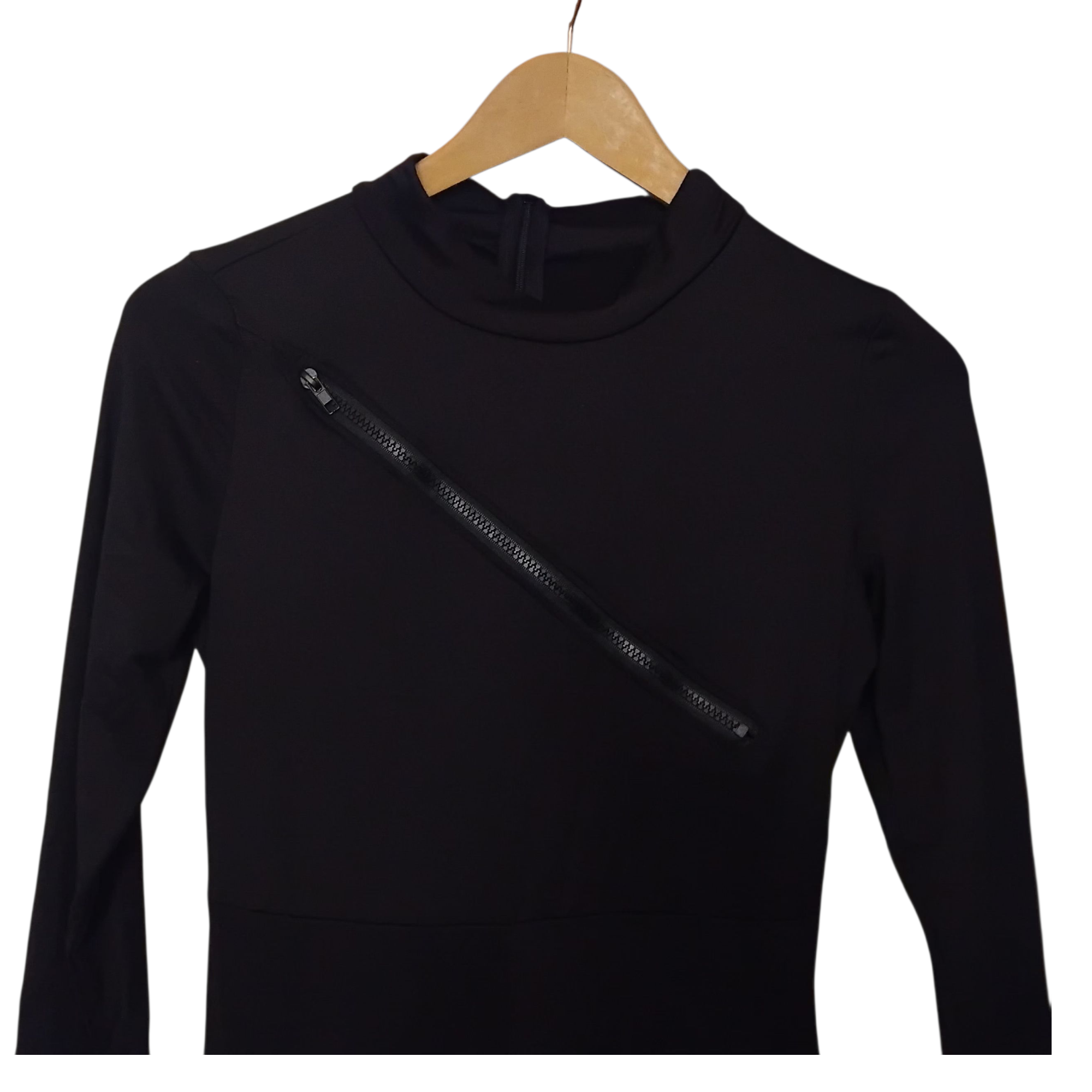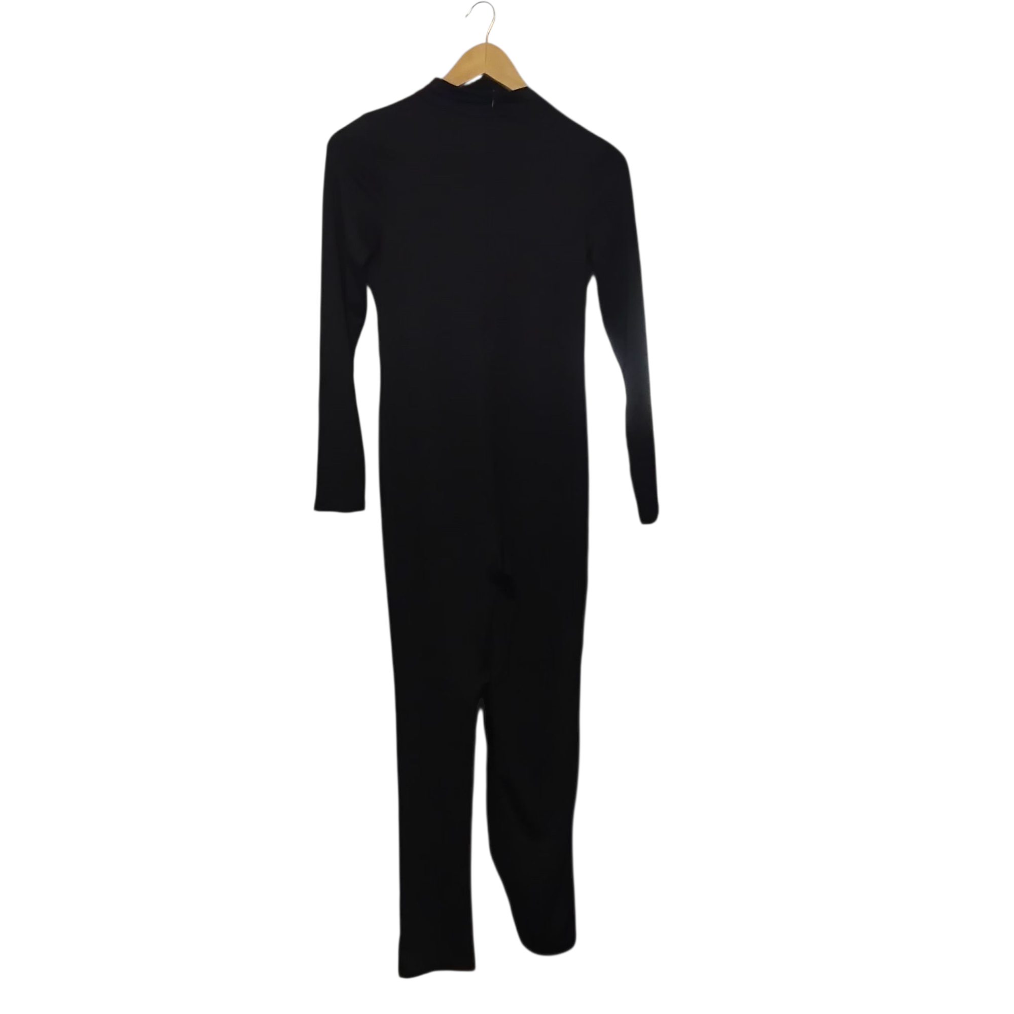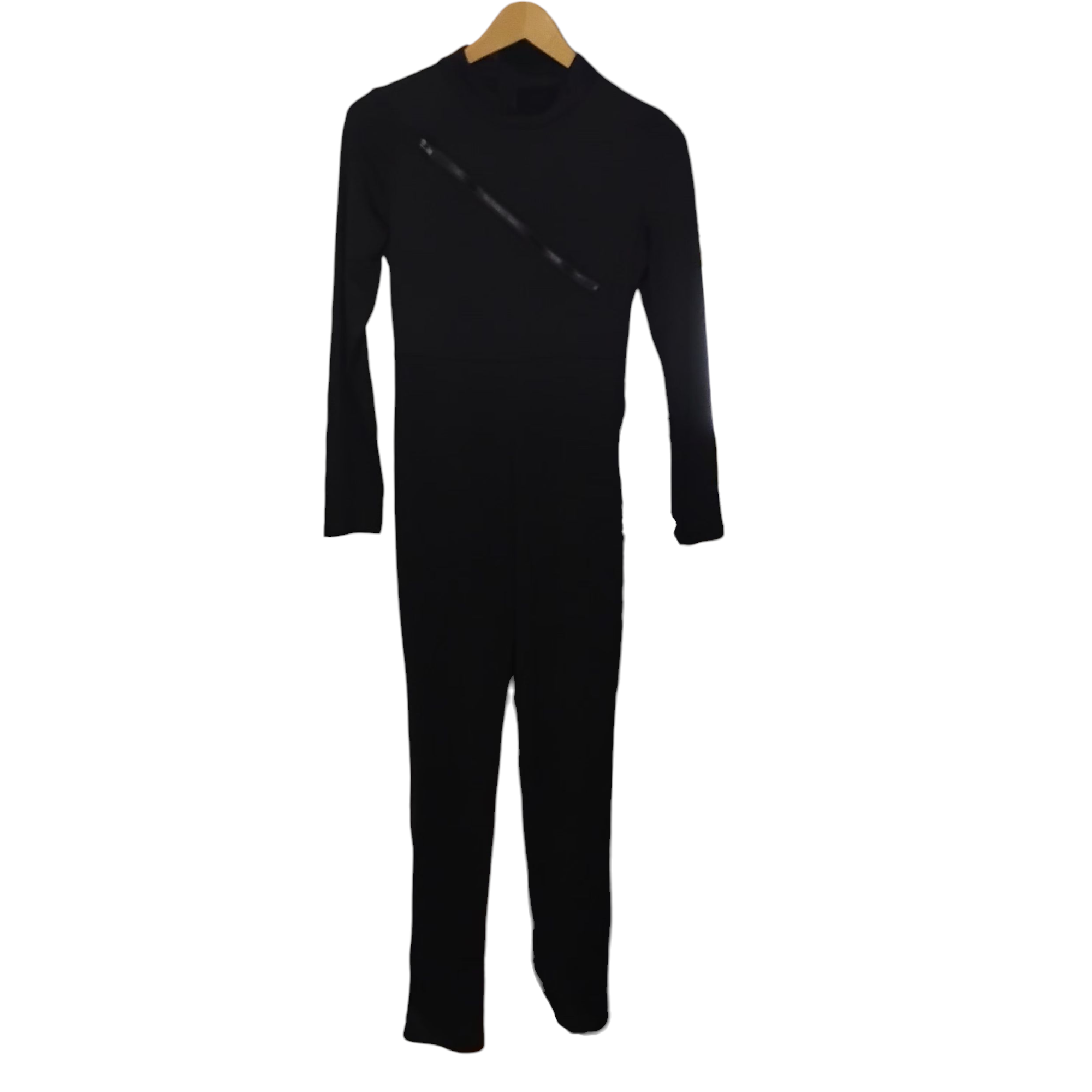 Kombinezon damski,czarny,zapinany na zamek na plecach,z przodu na piersiach zamek,materiał elastyczny,strona wewnątrwna miękki delikatny materiał.Stan bardzo dobry.