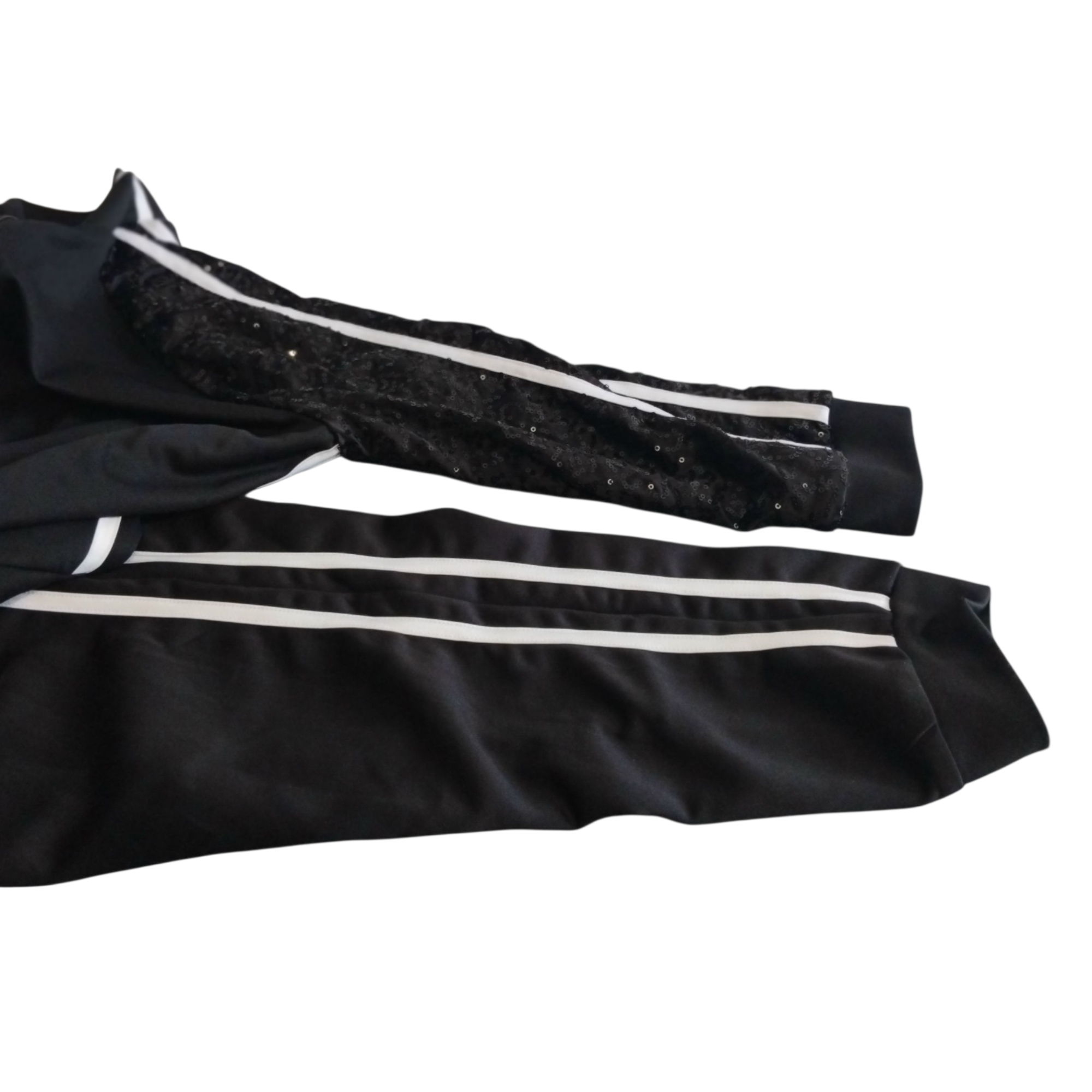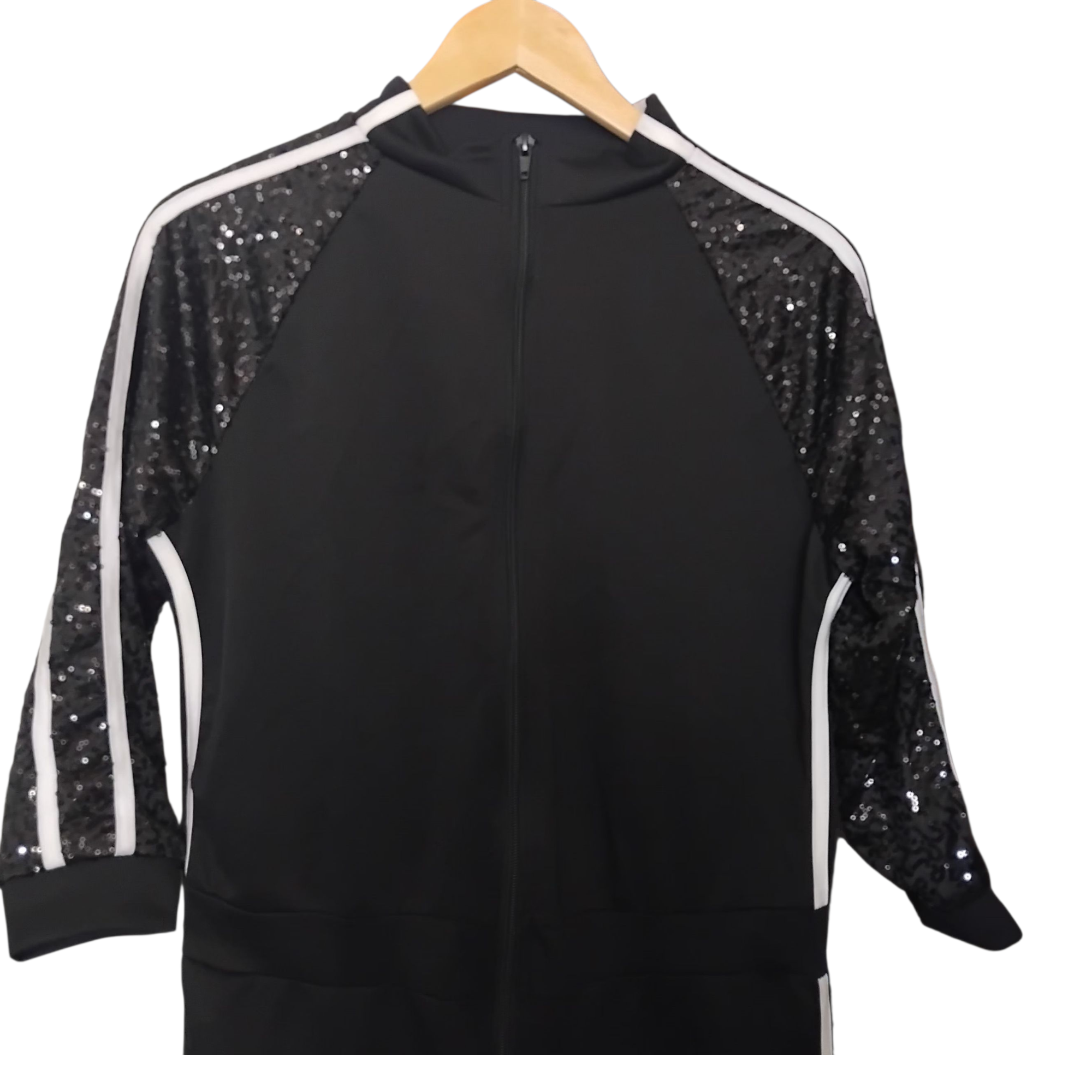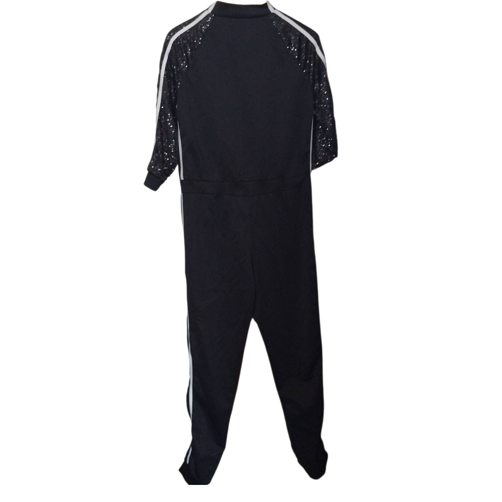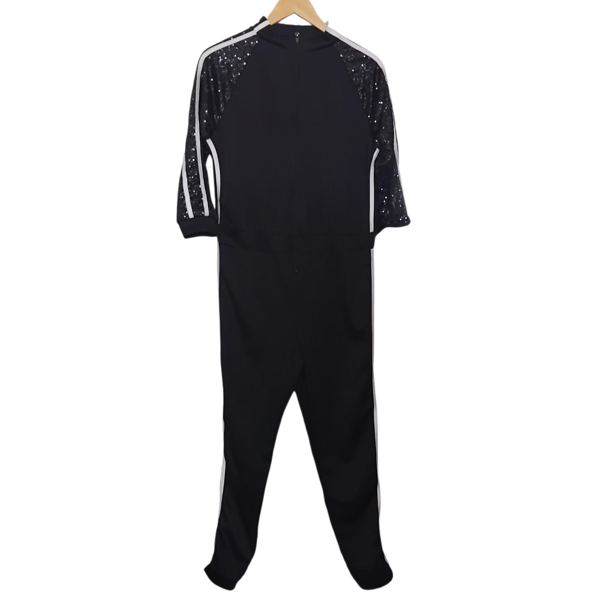 Kombinezon damski,do tańca,czarno-biały,zapinany na zamek z przodu,długi rękaw z cekinami,na bokach biały pasek,ściągacze przy rękawach I nogawkach.Stan dobry.