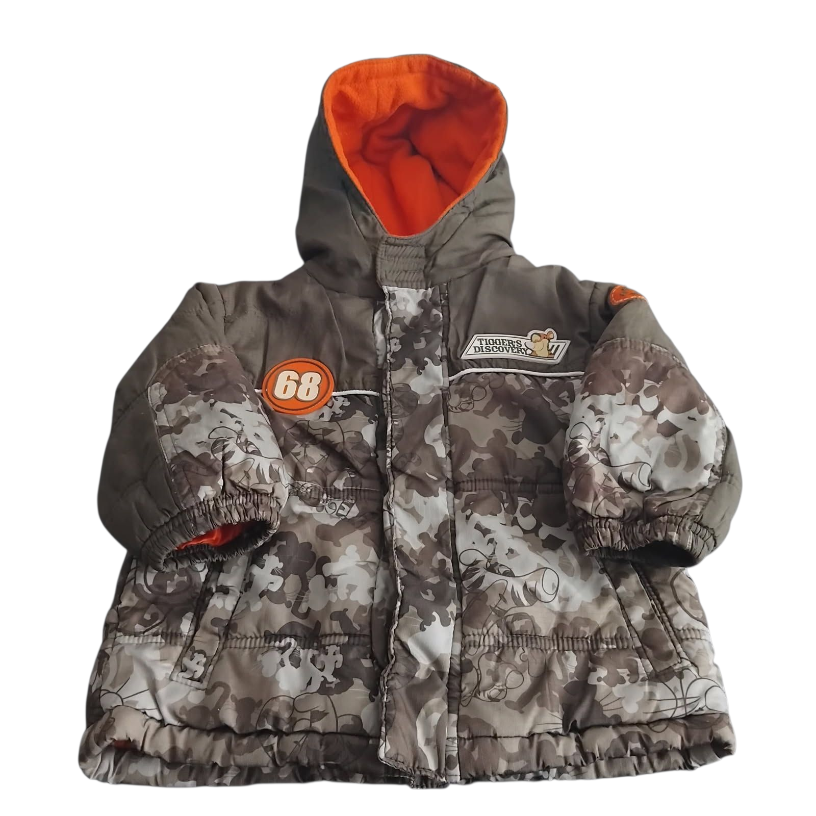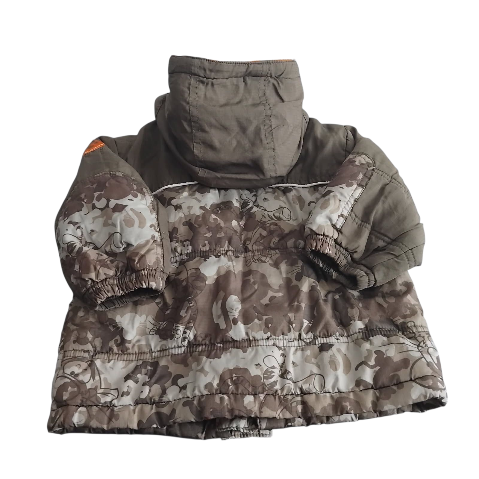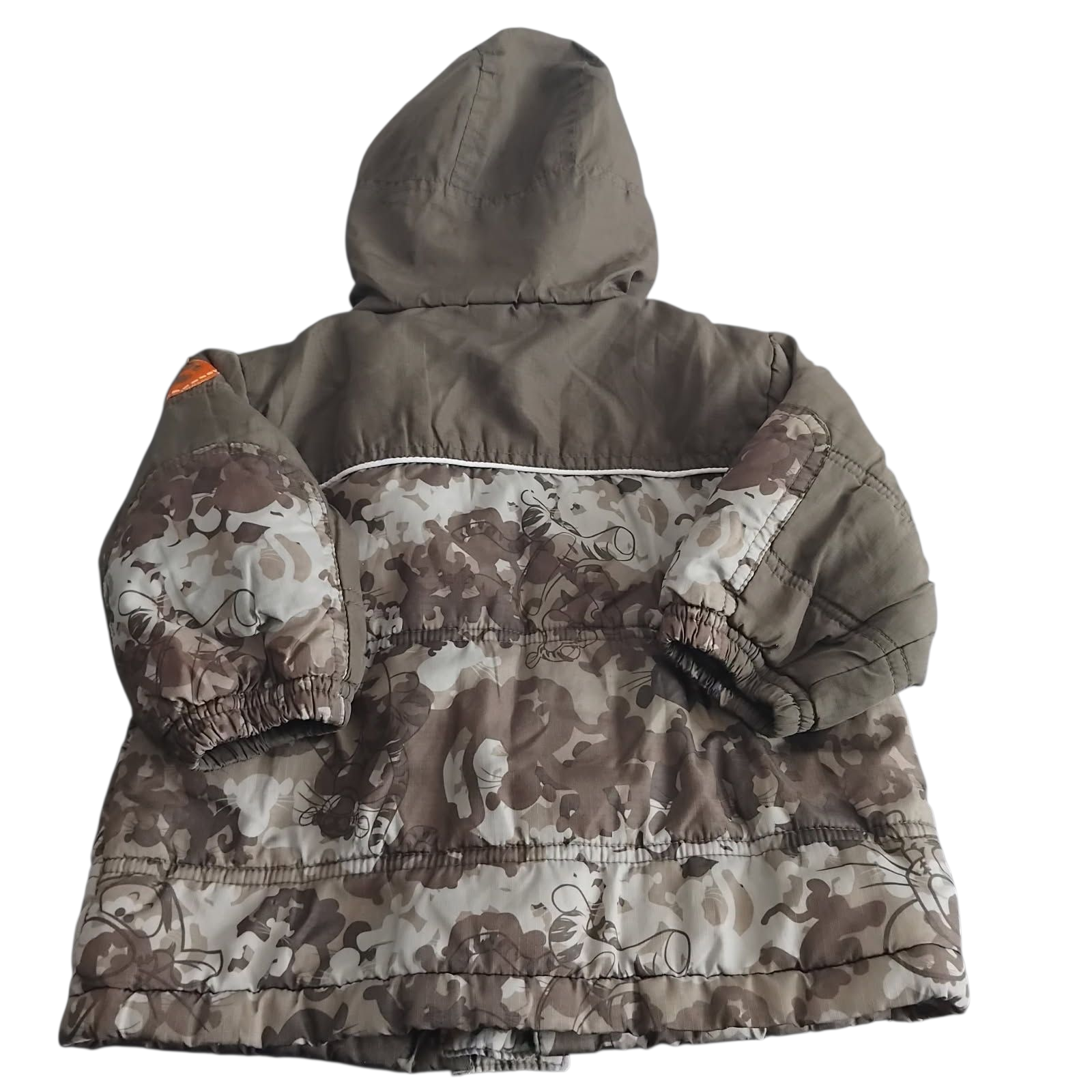 Kurtka dziecięca,zewnatrz-kolor zielony z kolorowymi aplikacjami,wewnątrz-pomarańczowy polar,zapinana na zamek I rzep,dwie boczne kieszenie,stan dobry-widoczne ślady użytkowania