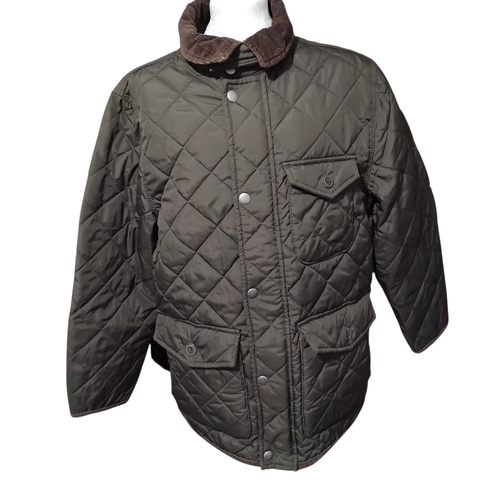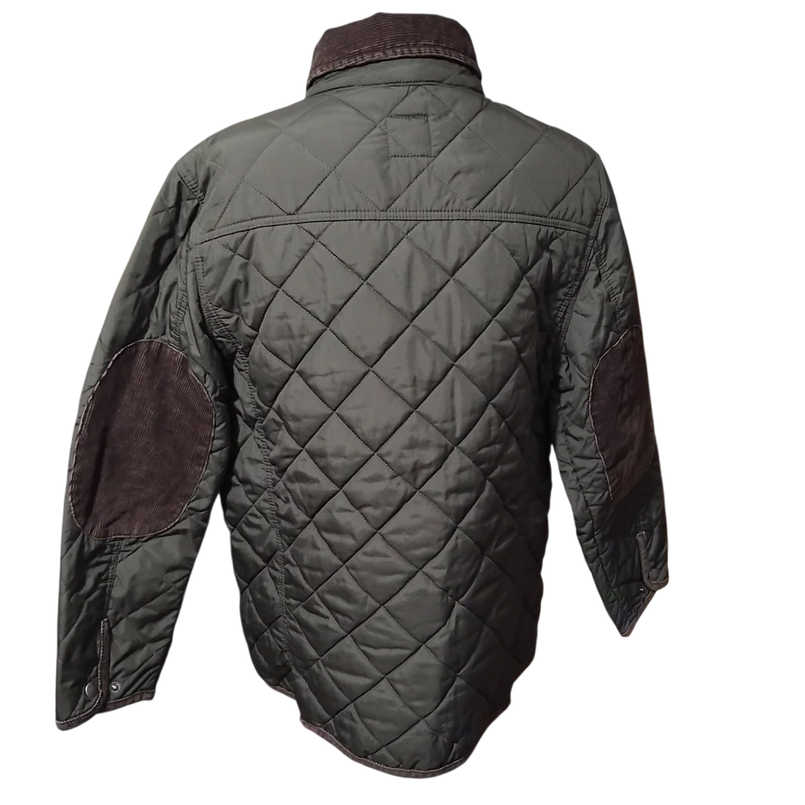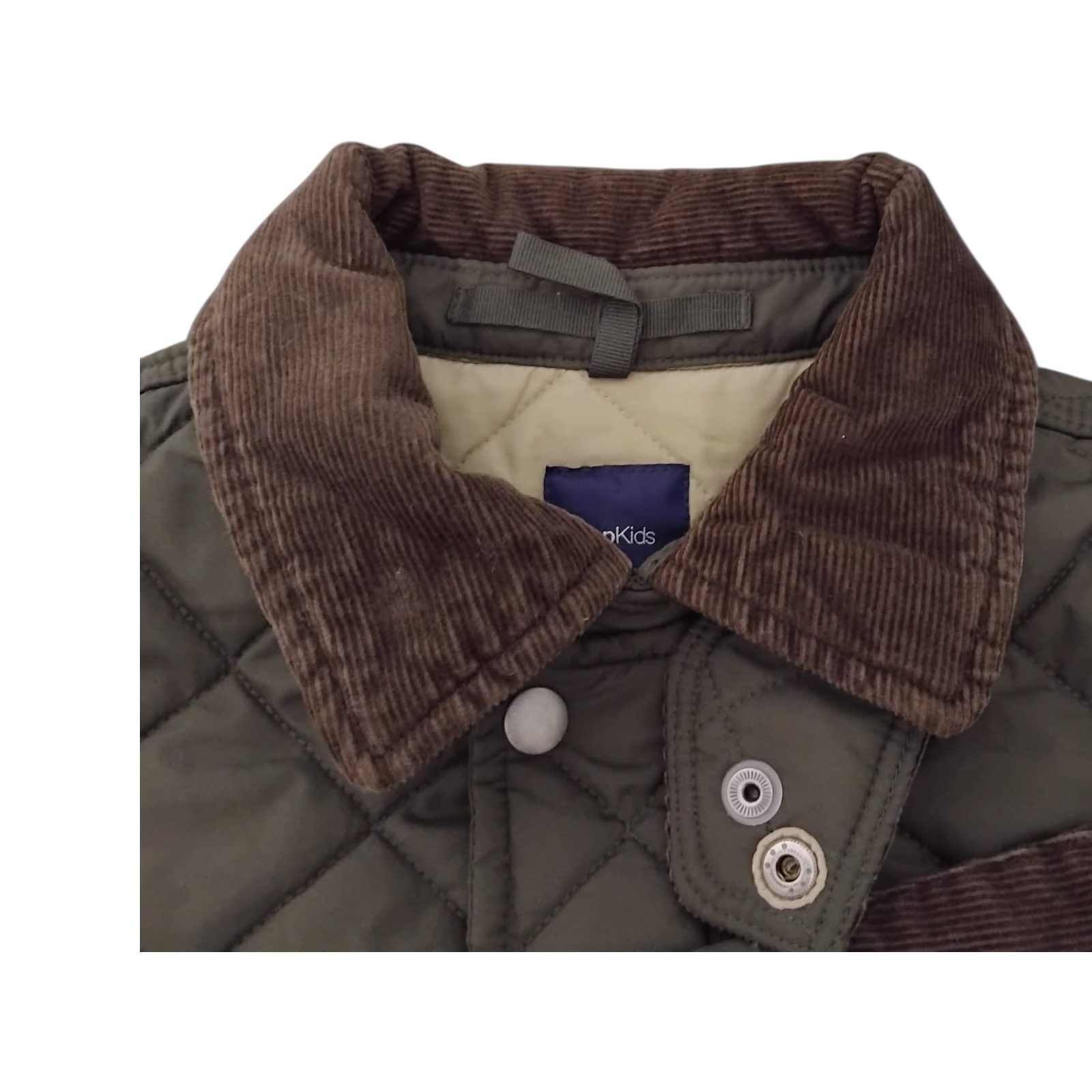 Kurtka dziecięca z sztruksowymi łatami (oryginalne) na rękawach,kołnierzem od wewnątrz oraz obszyciami rękawów.Zapinana na zamek I zatrzaski,dwie podwójne kieszenie boczne oraz jedna na lewej piersi,zapinane na guziki