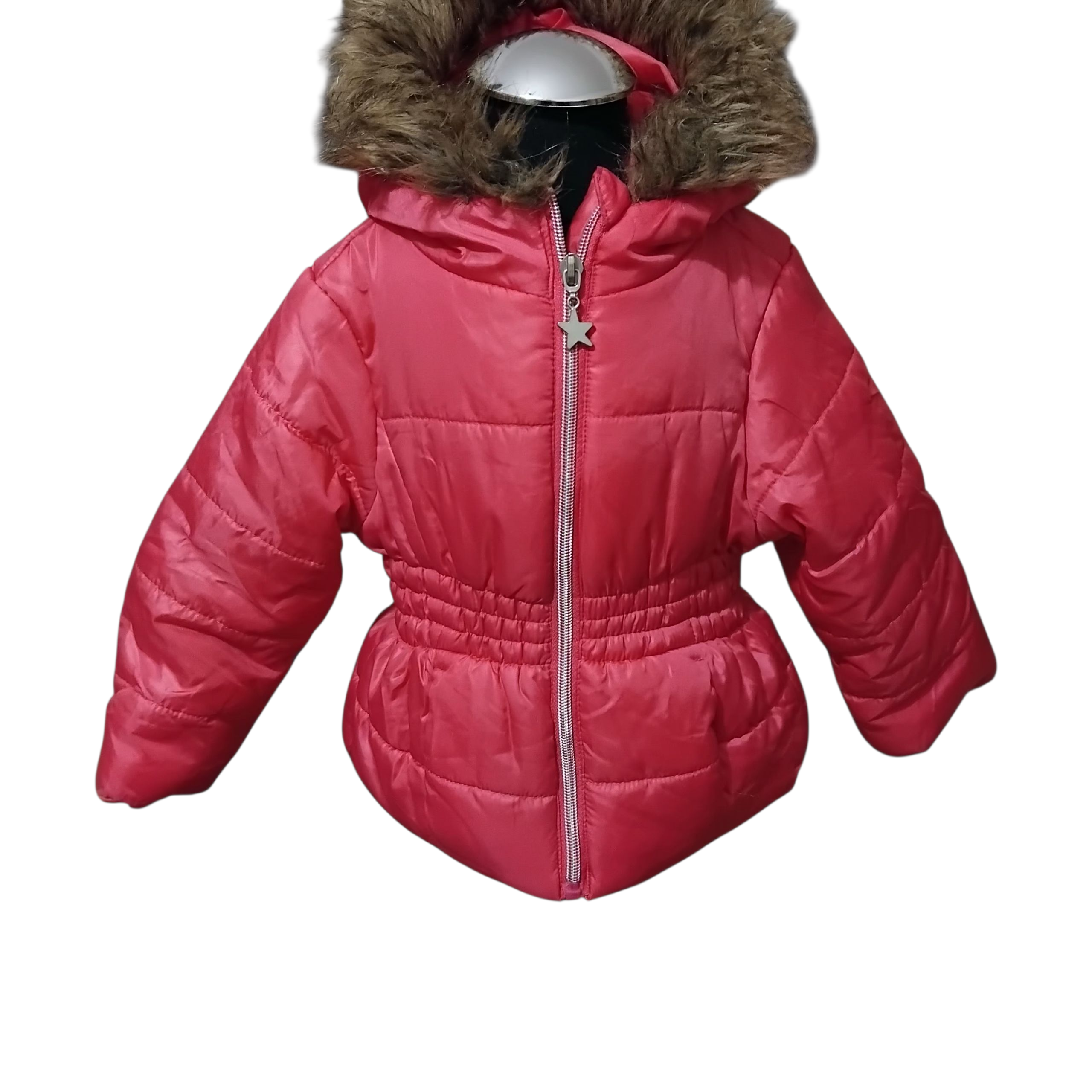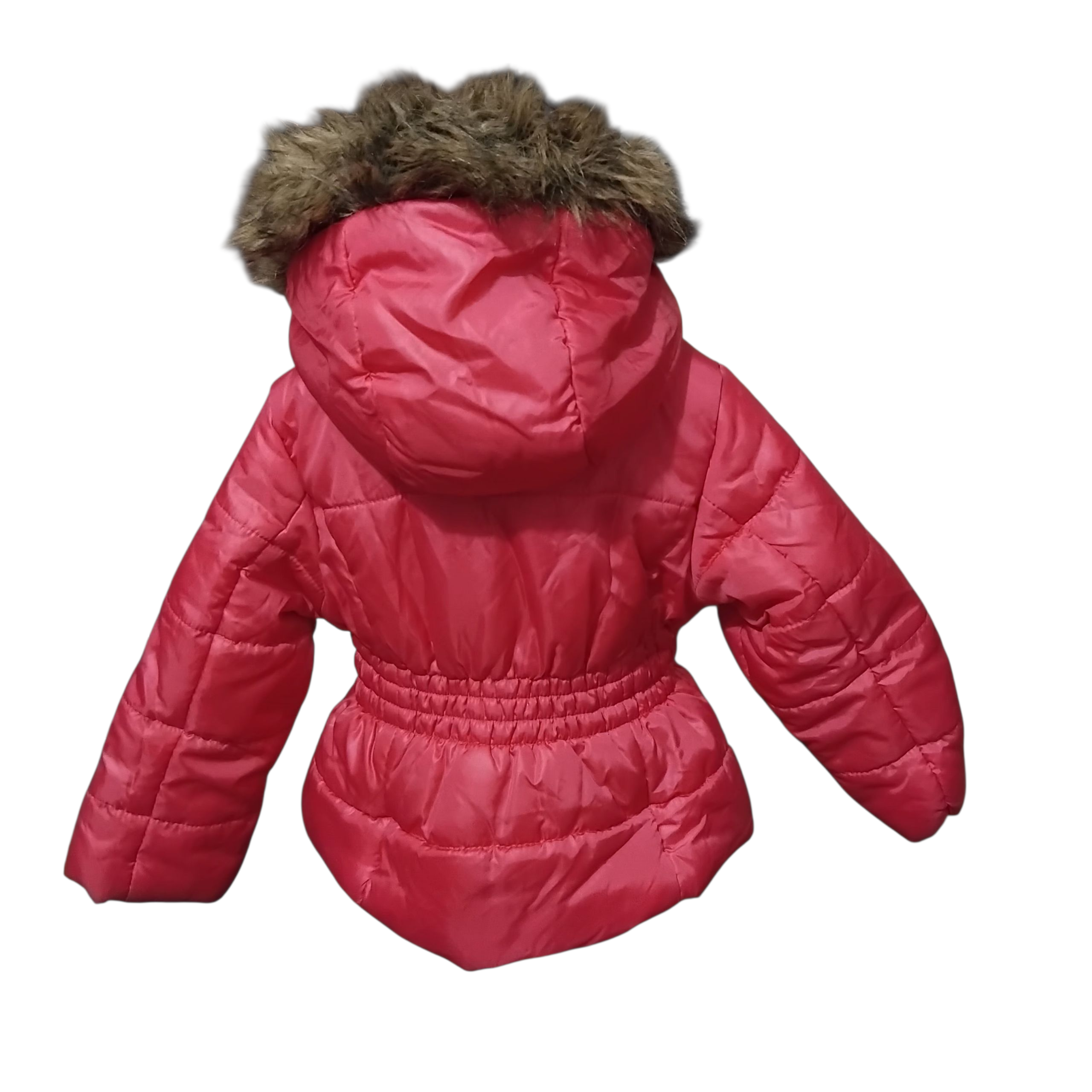 Kurtka dziewczęca zimowa,różowa z kapturem obszytym futerkiem,odcinana w pasie,zapinana na zamek.Stan bardzo dobry.