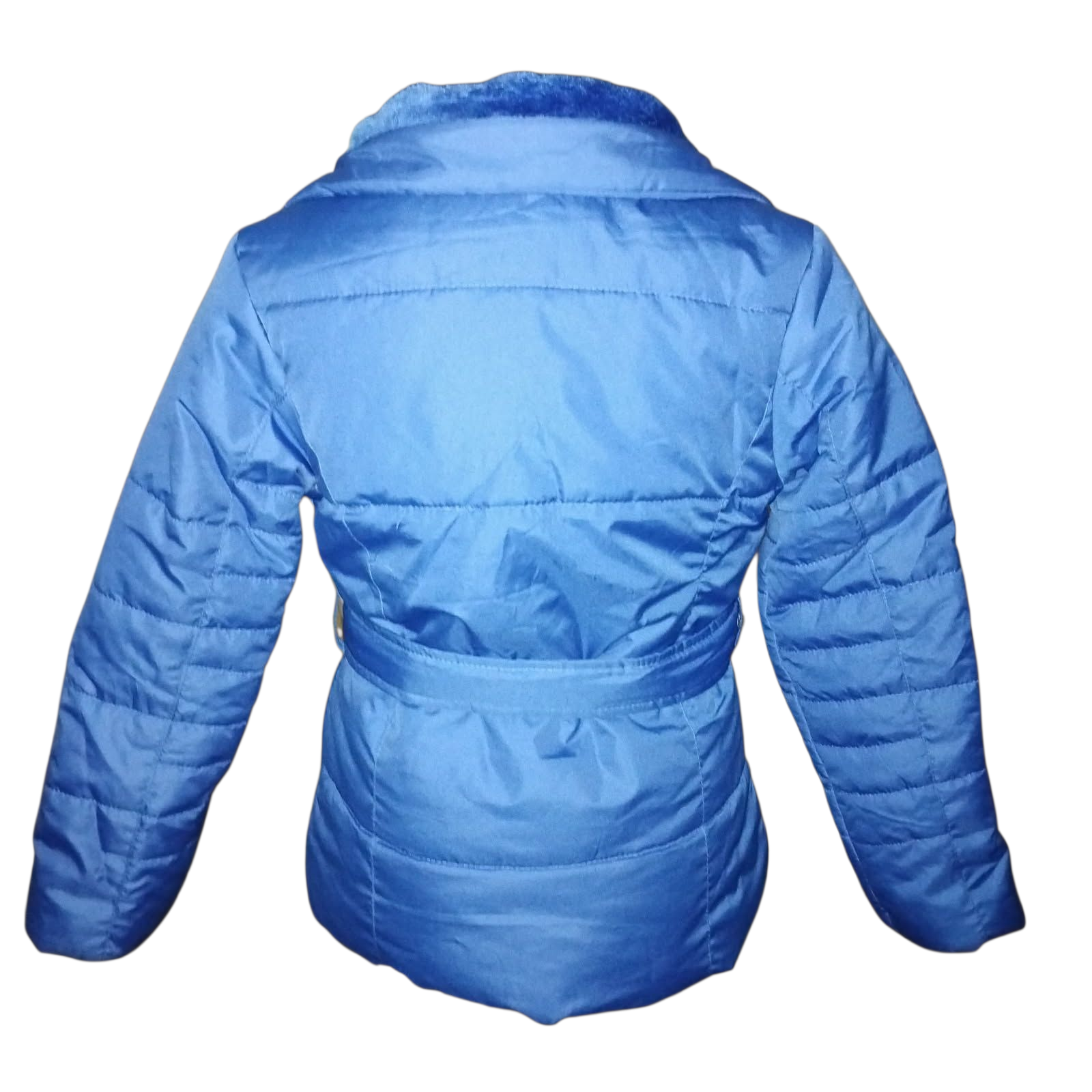 Kurtka dziewczęca z kołnierzem z futerkiem,zapinana na zamek i zatrzaski,dwie boczne kieszenie na zamek,pasek.Stan bardzo dobry