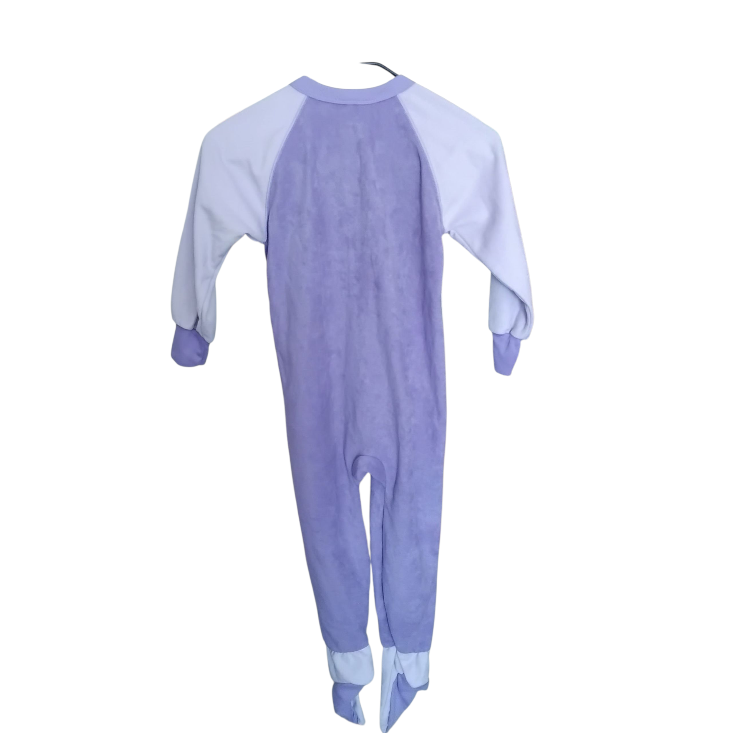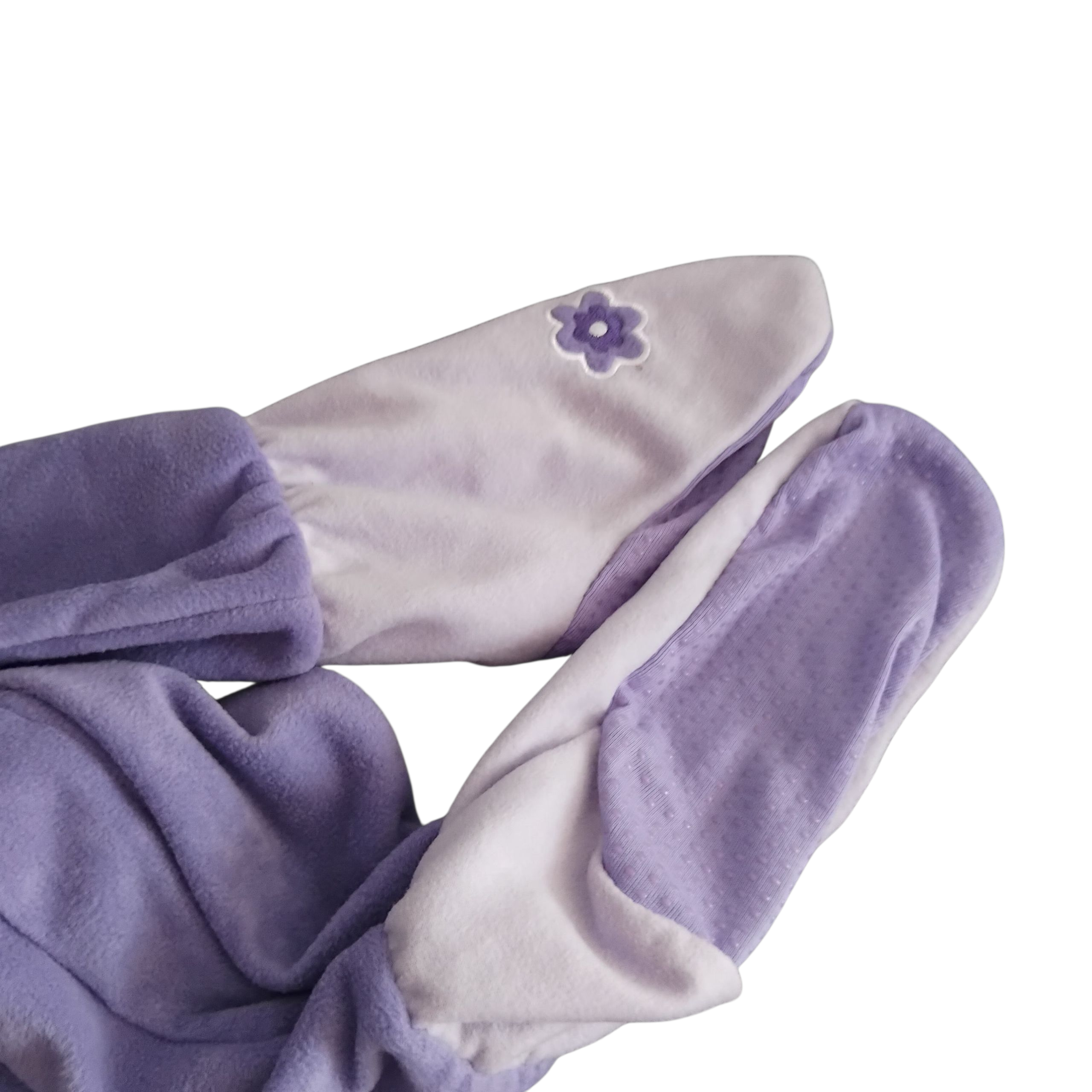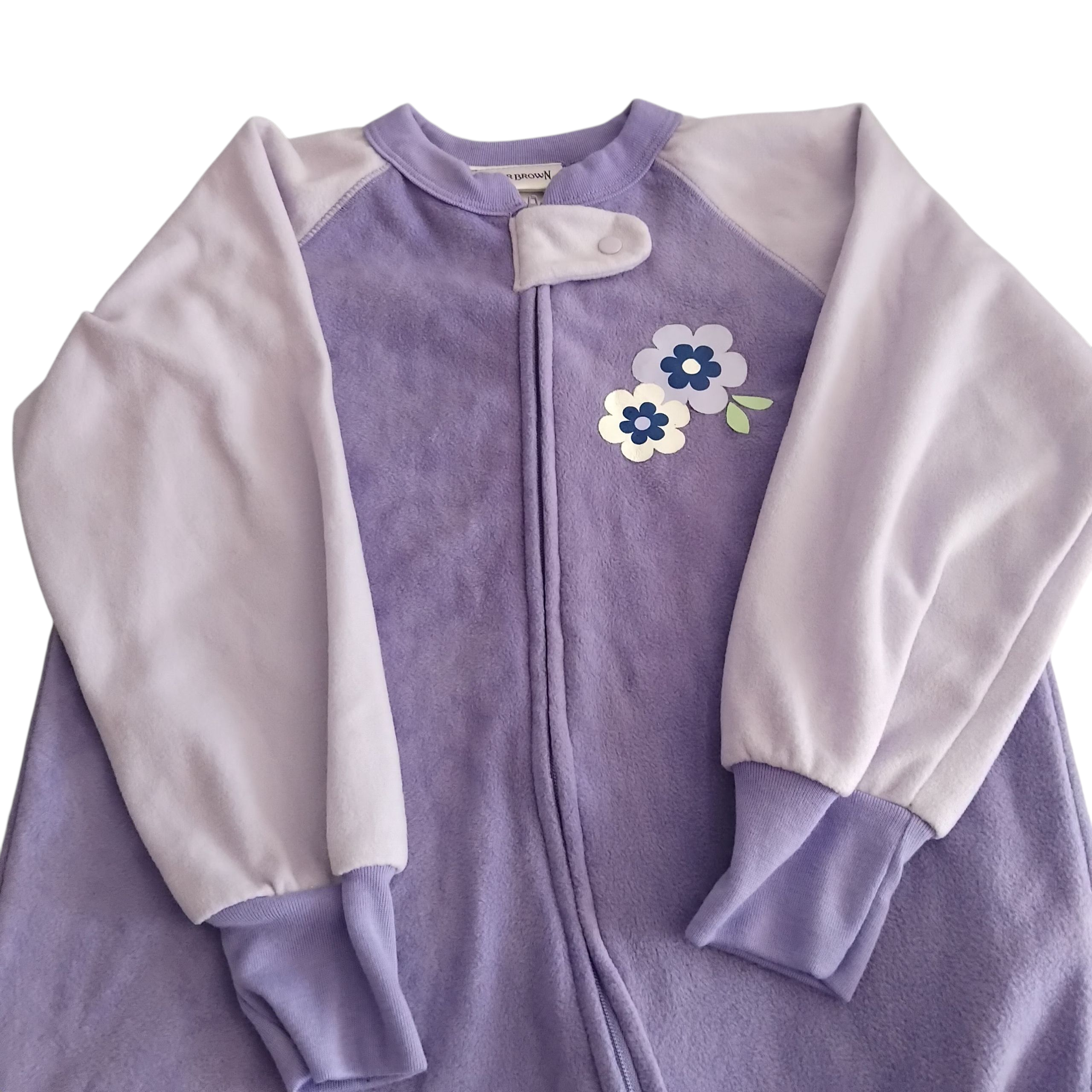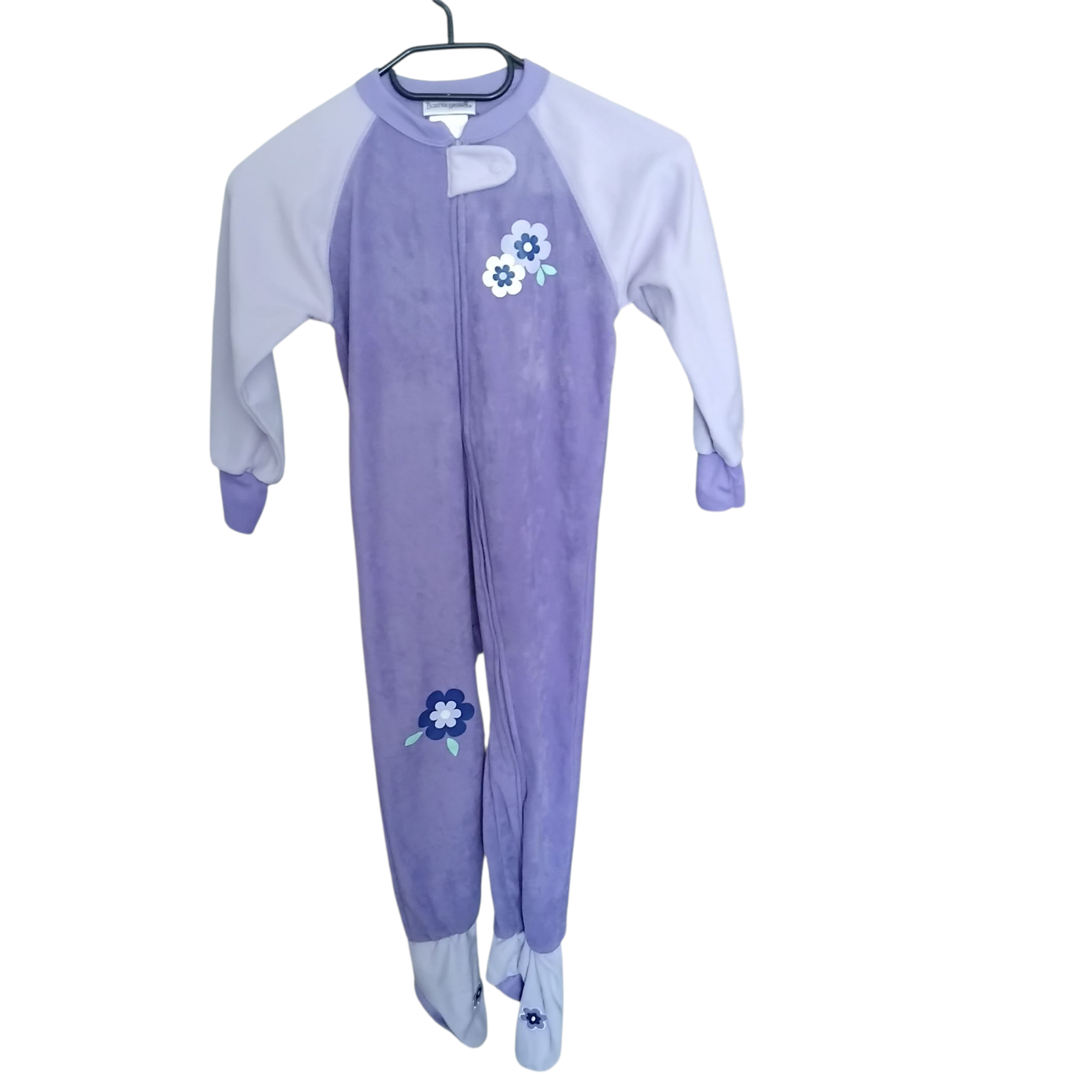 Piżama dziecięca (pajacyk) kolor-odcienie fioletu,z aplikacją w kwiaty, zapinana na zamek i zatrzask,stopy pełne,spód gumowany(antypoślizgowy),rękawy na ściągaczach,cienki polar.Stan bardzo dobry
