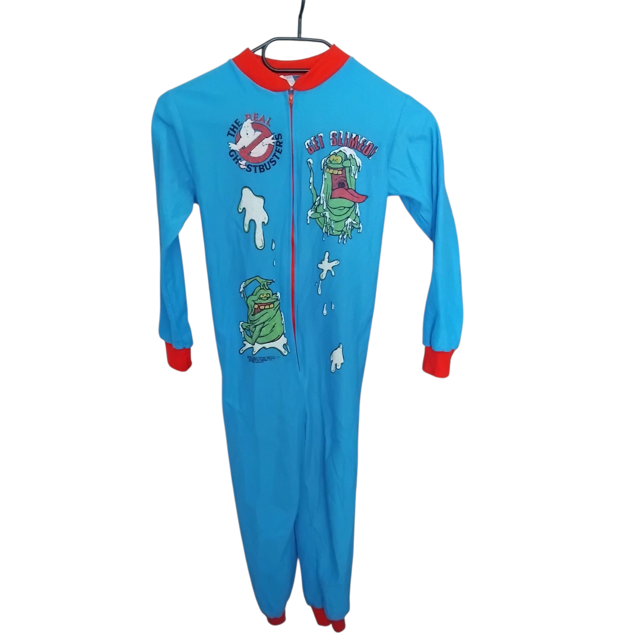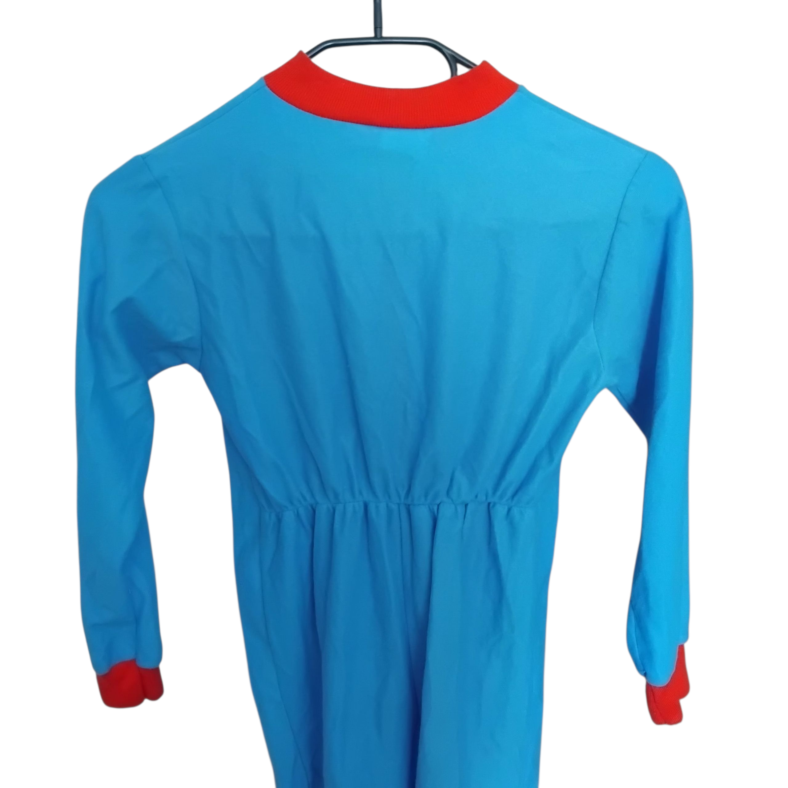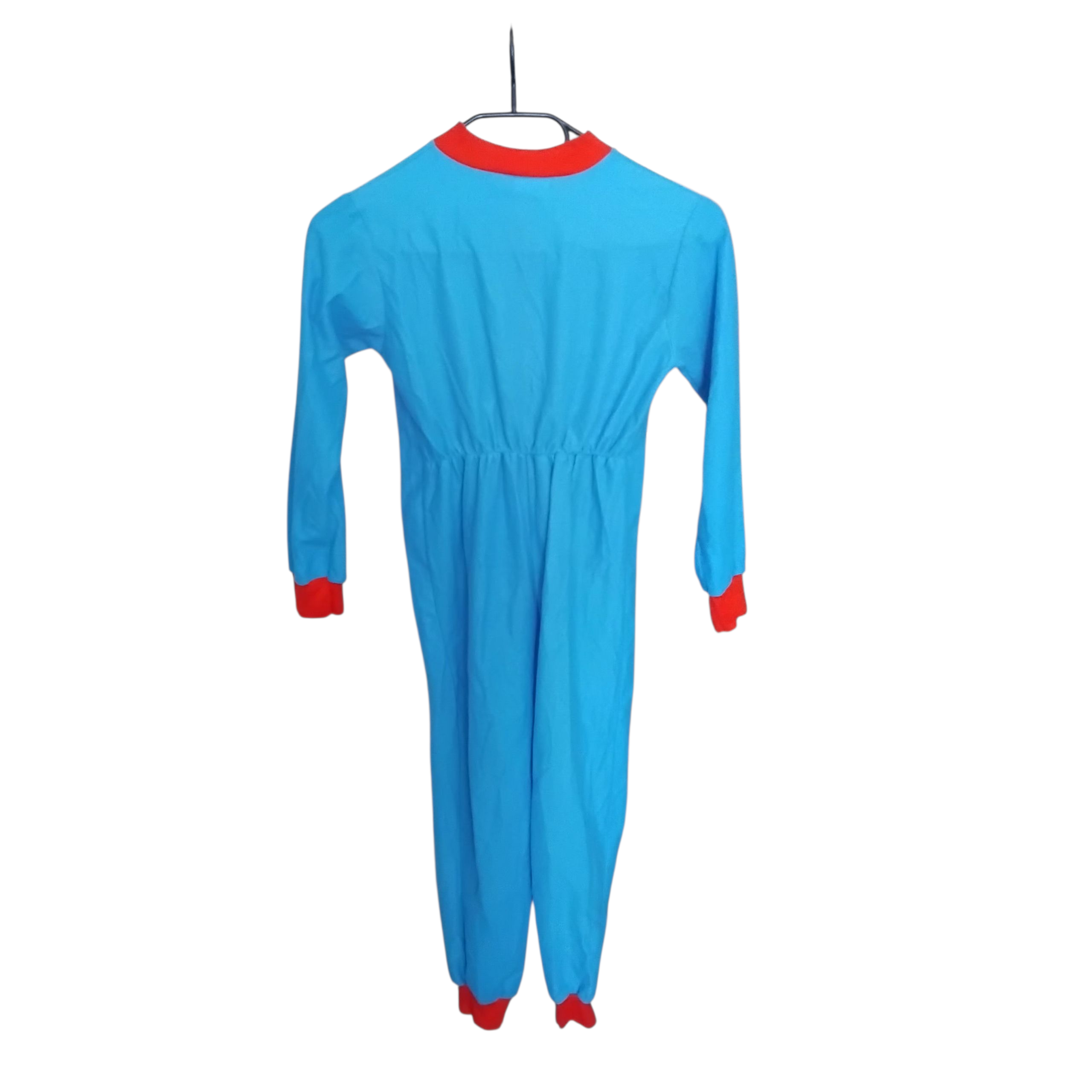 Piżama (pajacyk) kolor niebieski z kolorową aplikacją z przodu,obszycia szyi,rękawów i stóp-kolor czerwony, ściągacze przy rękawach I nogawkach,zapinany na zamek, cienki polar.Stan bardzo dobry