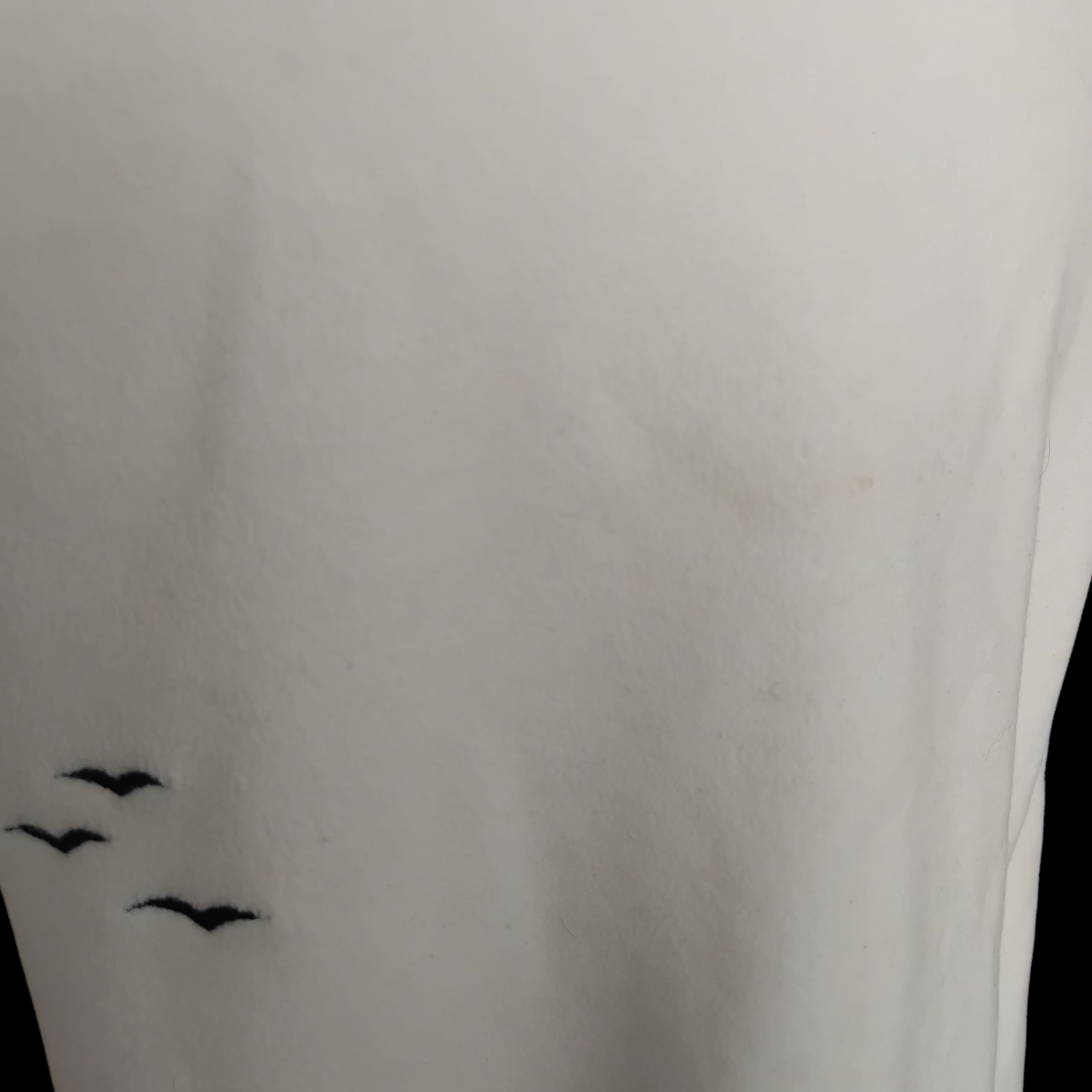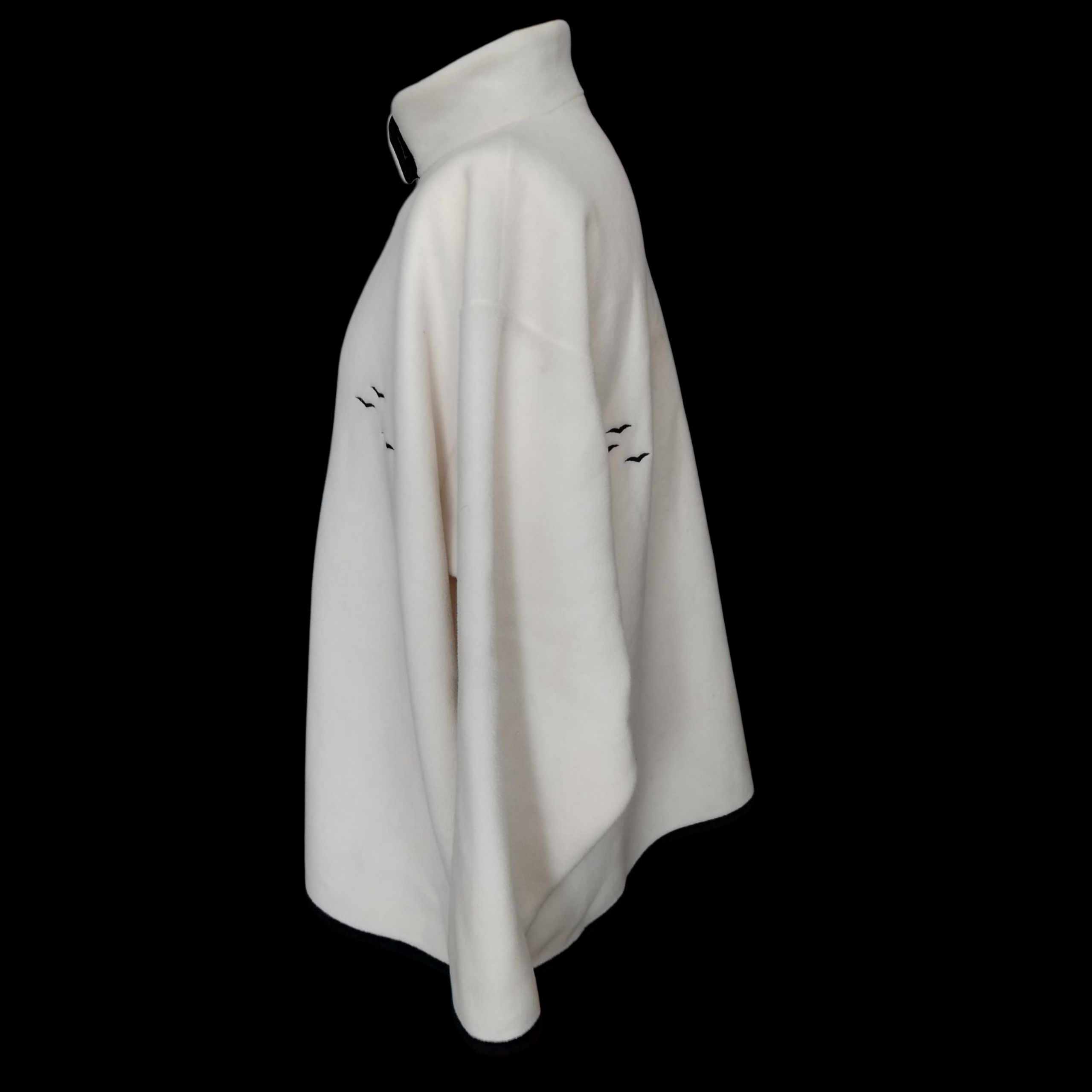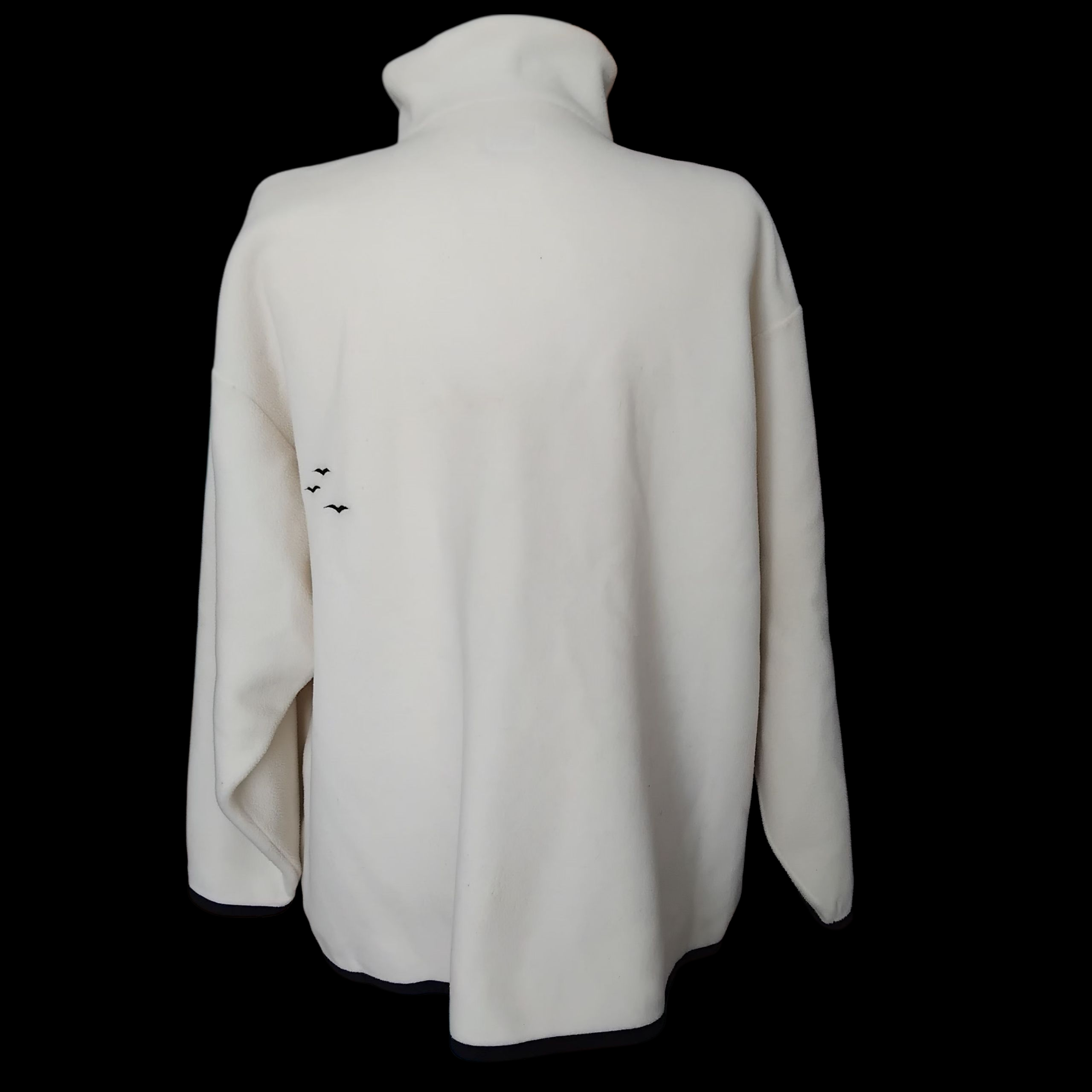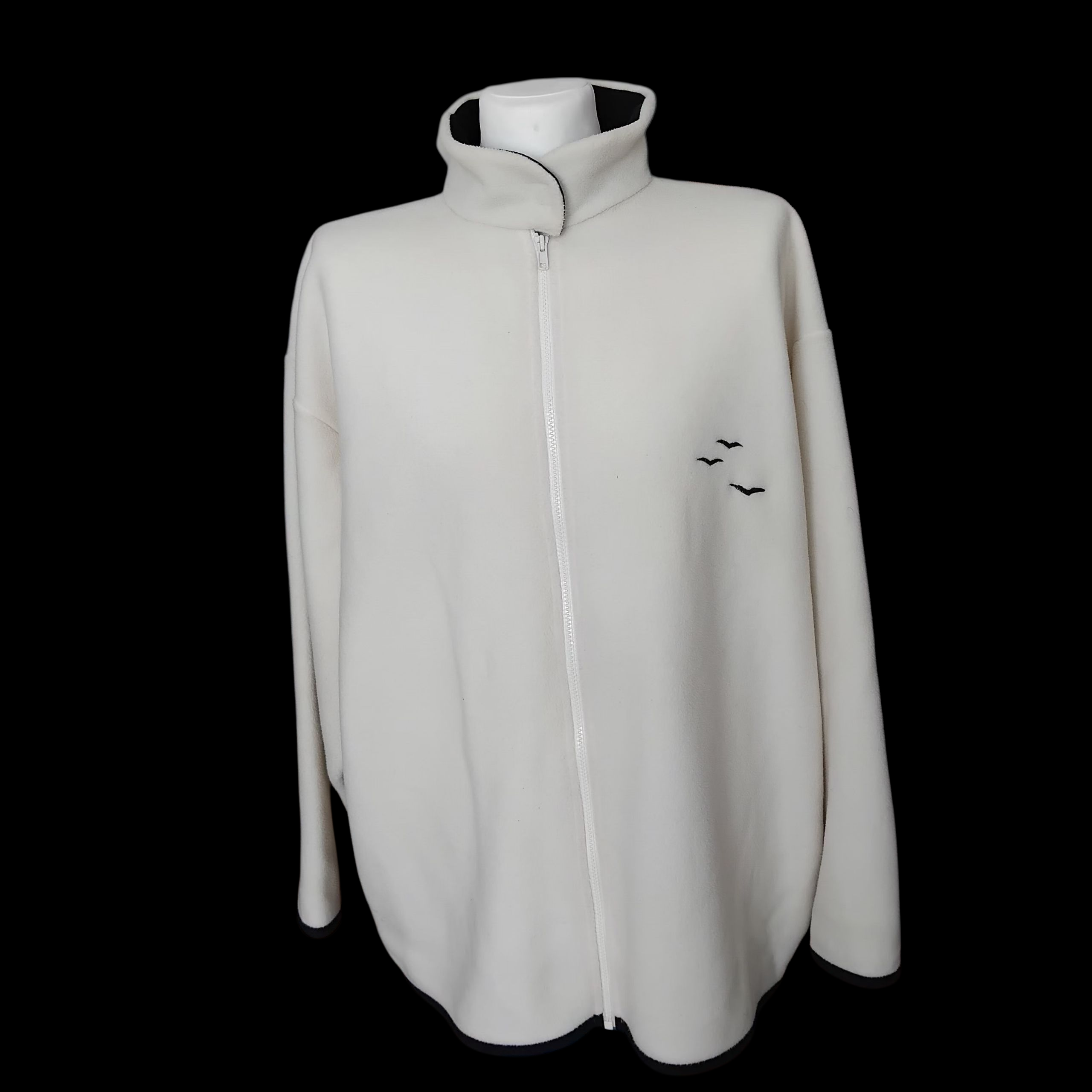 Polar męski,kolor ecru z czarnymi obszyciami i małymi aplikacjami z przodu na piersi lewej i na plecach.Zapinany na zamek,kołnierz na rzep,miękki,dwie boczne kieszenie.Stan dobry,delikatne plamy powystawowe.