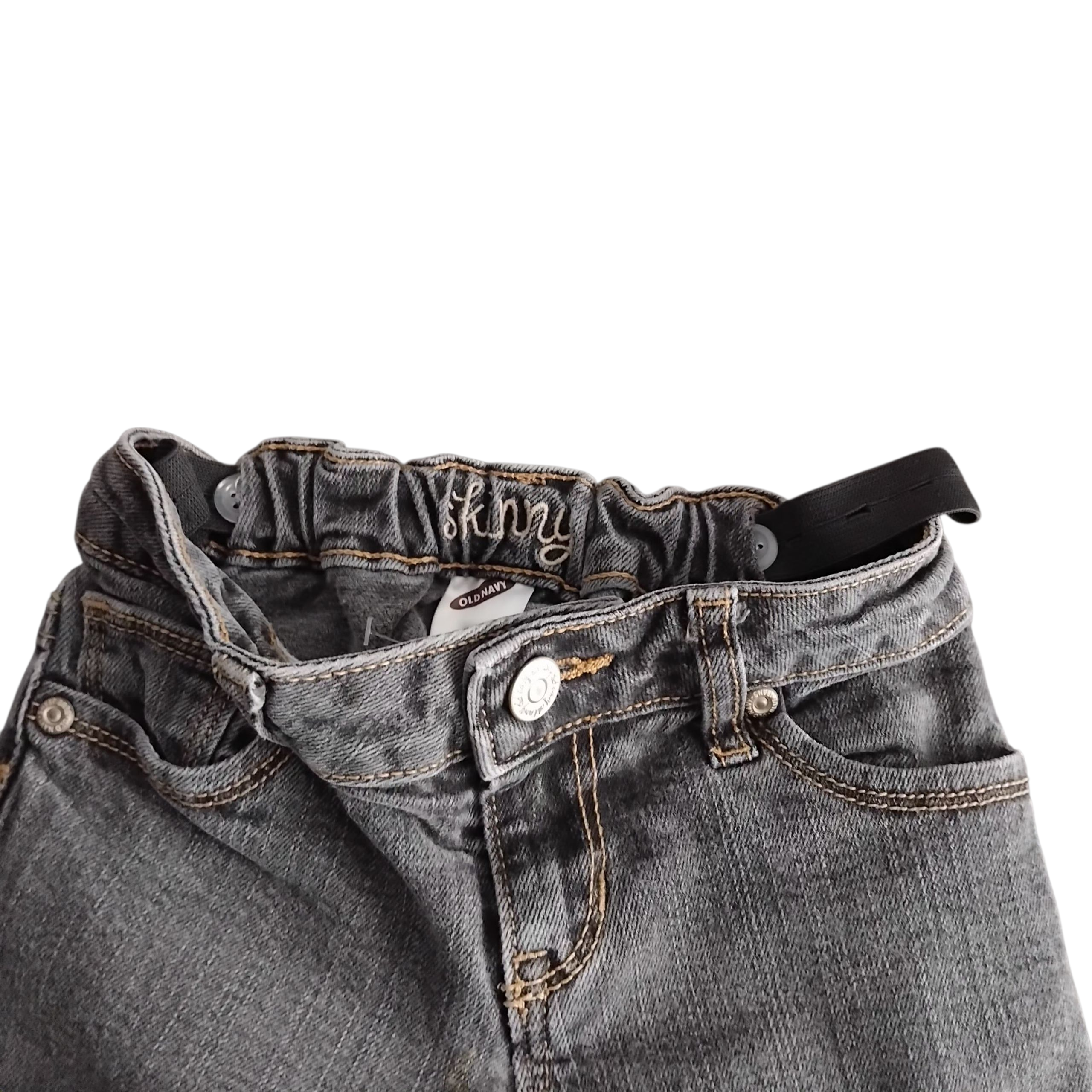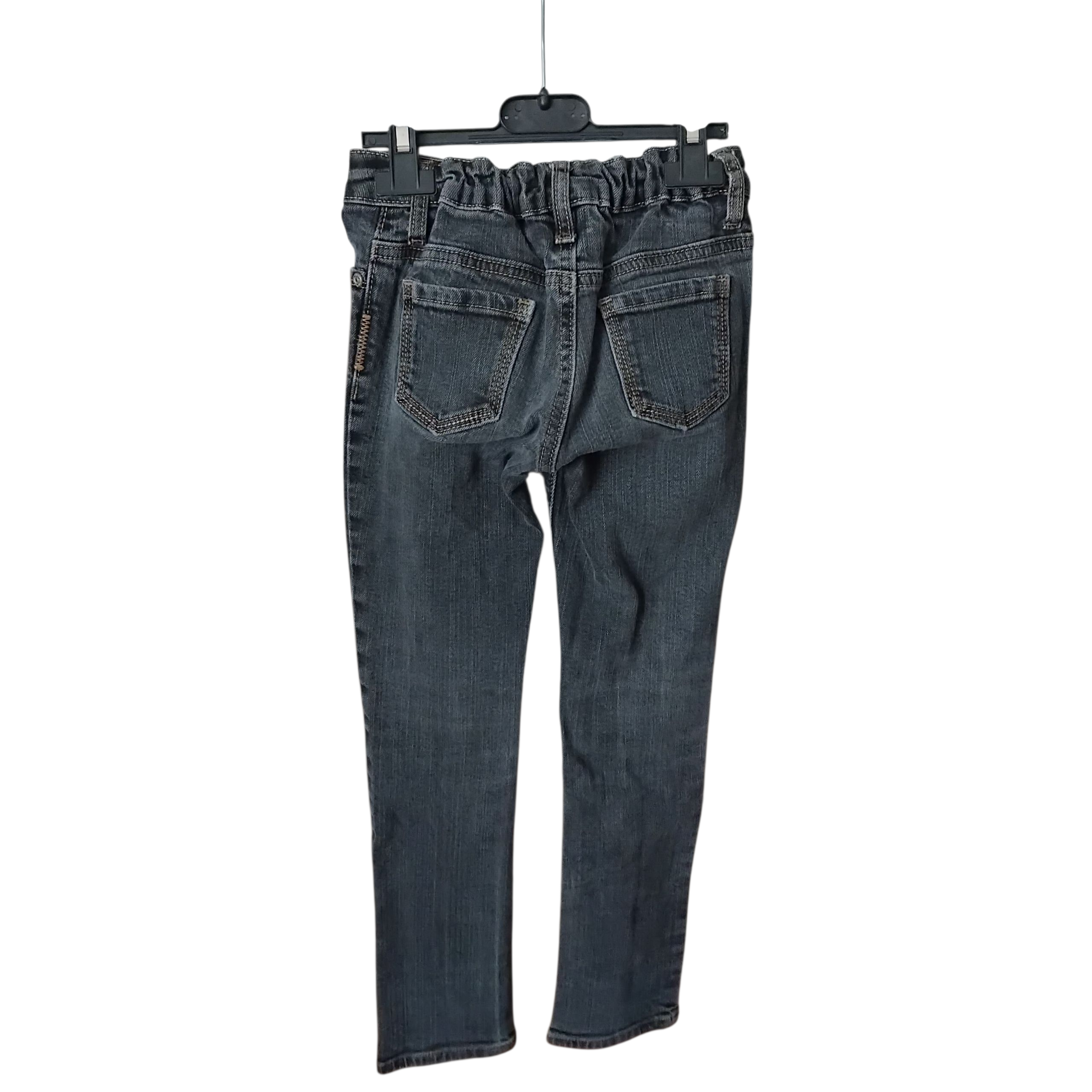 Spodnie jeans dziewczęce,szare rurki,w pasie wszyta gumka do regulacji szerokości,pas na guzik i zamek,lekkie ślady użytkowania na kolanach.Stan dobry.