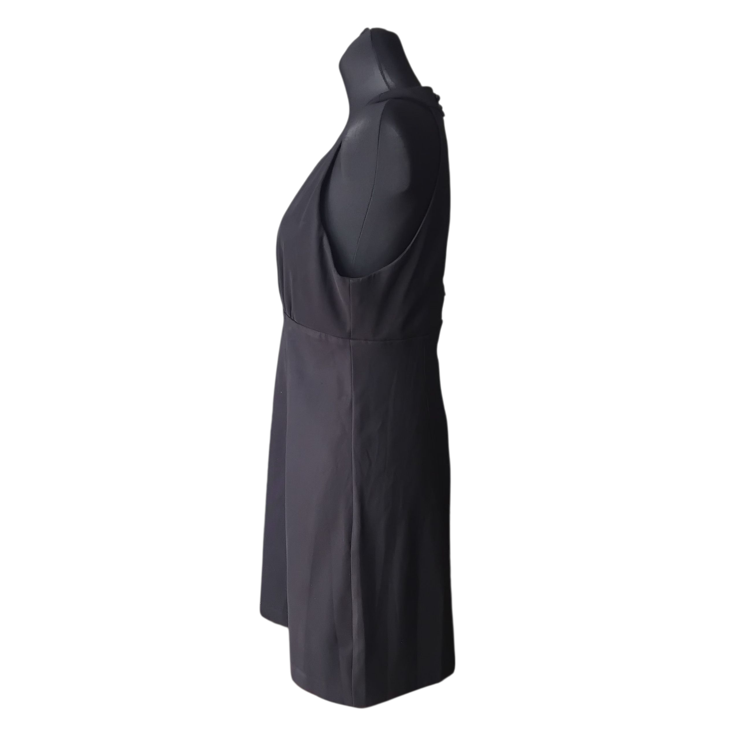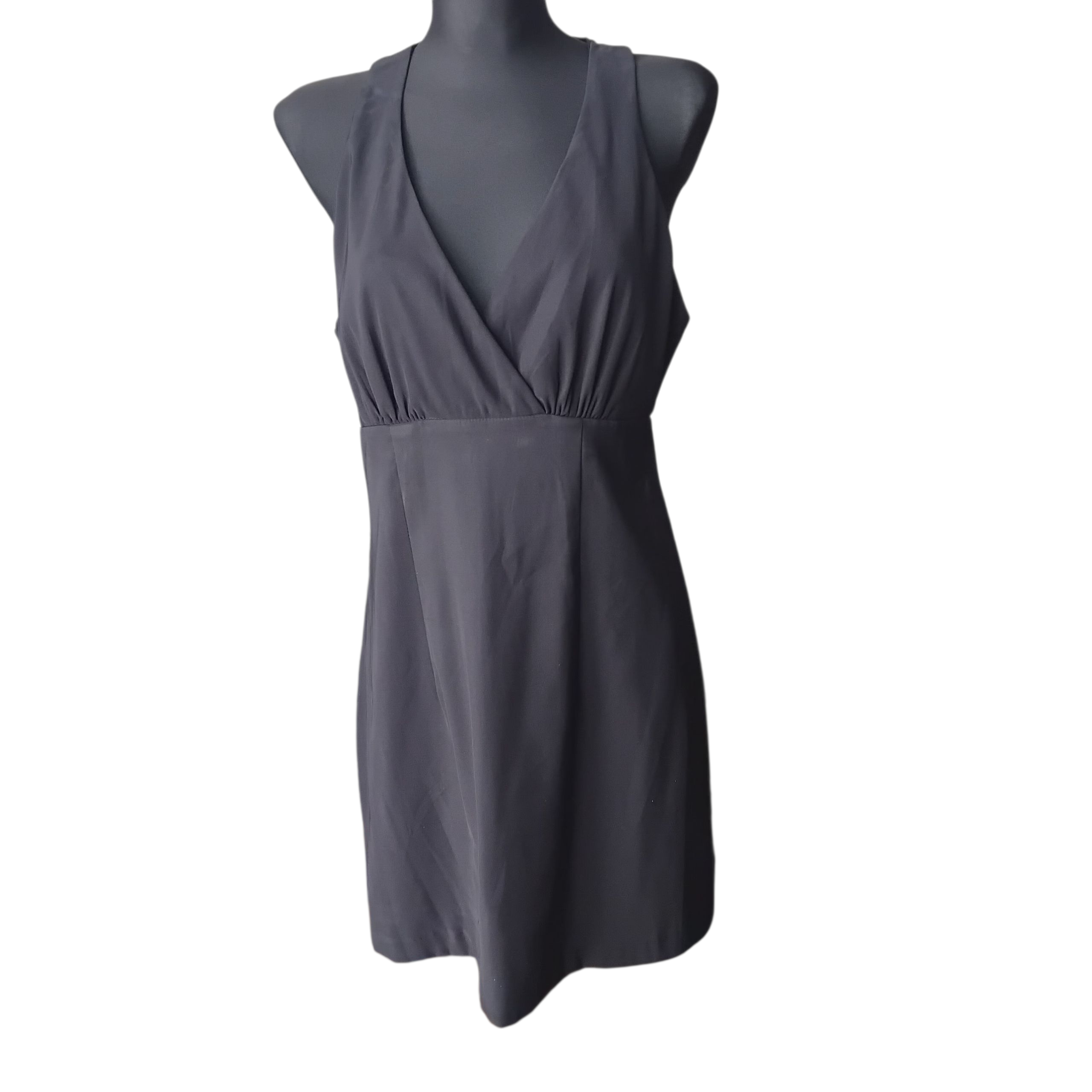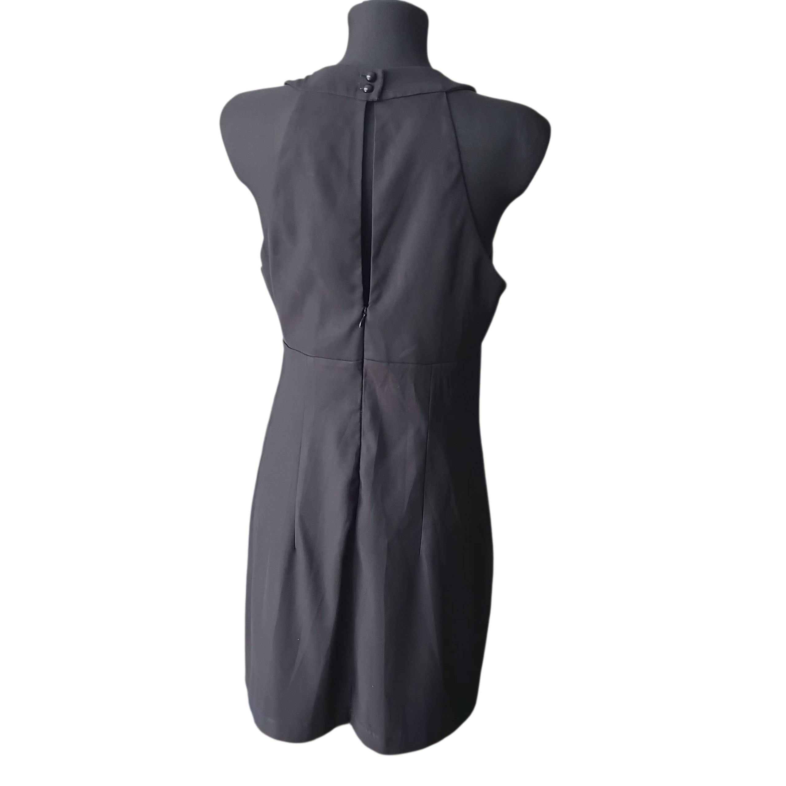 Sukienka z głębokim dekoltem,bez rękawów,zapinana na zamek i guziki na plecach,rozkloszowana od pasa w dół.Materiał lekko elastyczny.Stan dobry.